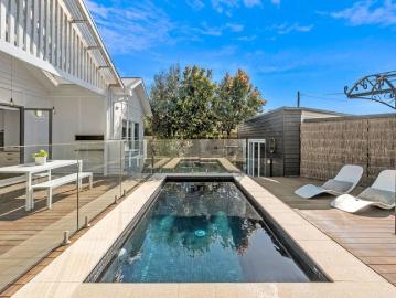 This beautifully restored Californian bungalow offers the perfect blend of heritage charm and modern luxury positioned in one of Drumcondra's most picturesque tree-lined streets. Just a short stroll from Geelong's picturesque waterfront, Deakin University, the CBD, and the vibrant Pakington Street precinct, this four-bedroom residence delivers an exceptional lifestyle in a truly coveted location. From the moment you arrive, the home's character and warmth are unmistakable. Designed with family living and entertaining in mind, it features multiple indoor and outdoor spaces, including a solar-heated, fully decked pool and a north-facing alfresco deck that invites year-round enjoyment. The original front rooms showcase exquisite period details including leadlight windows, ceiling roses, picture rails, and rich timber accents, while the rear extension introduces the contemporary edge. Here, a light-filled open-plan kitchen, dining, and living area unfolds beneath high ceilings, anchored by